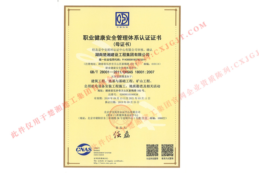 職業健康安全管理體系認證證書